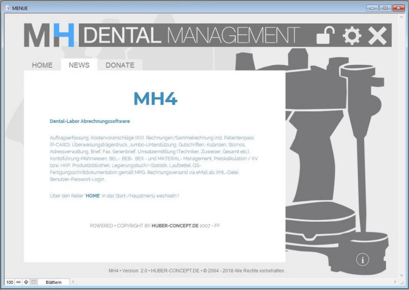 Die Software „MH4“ basiert auf einer Datenbank. (Filemaker) arbeitet plattformübergreifend, d.h. sowohl auf MS Windows 7 ... 10 als auch Apple (MacOS X ≥ 10.13) sowie iOS ≥ 9 - Betriebssystem (die jeweilige Variante von MH4 ist gesondert aus dem Internet unter https://www.mh4.me herunterzuladen).